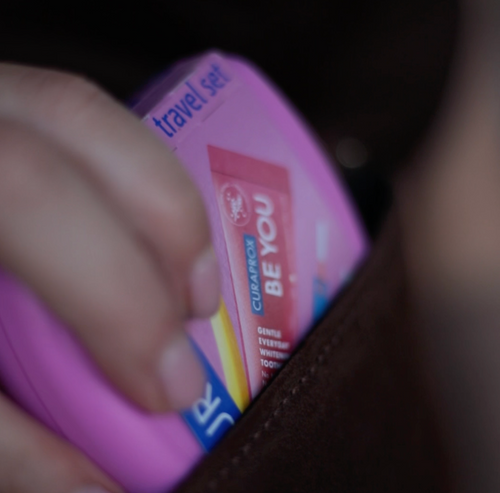 Komplektą sudaro "Curaprox Be You" kelioninis rinkinys (minkštas dantų šepetėlis (1 vnt.), balinanti dantų pasta (10 ml), tarpdančių šepetėliai (2 vnt.)) ir "Apacare Gum" kramtomoji guma su emalio mineralais ir saldikliu ksilitoliu. Kai kurių pastilių skonių galime šiuo metu neturėti.