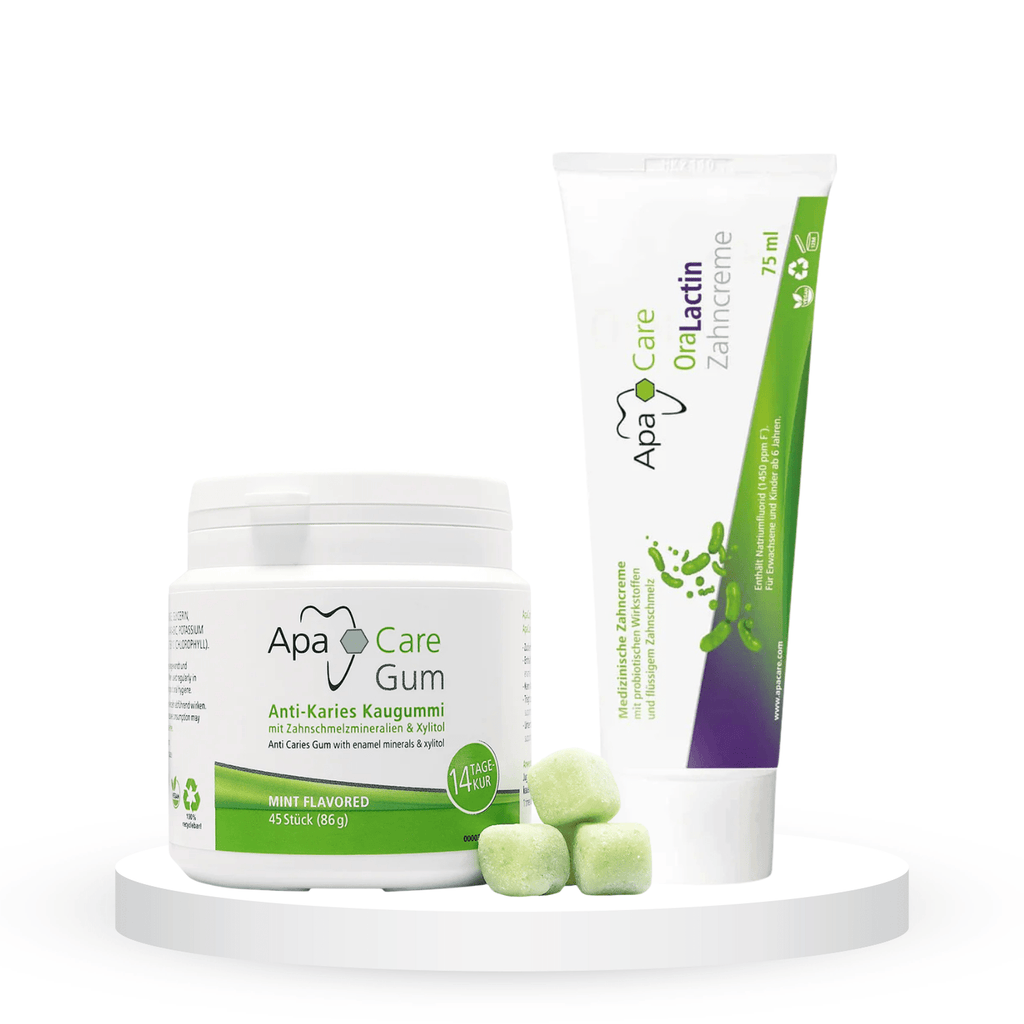 Šį komplektą sudaro "ApaCare Gum" kramtomoji guma su saldikliu ksilitoliu ir emalio mineralais (45 vnt.) ir "Apacare Oralactin" remineralizuojanti dantų pasta su emalio mineralais ir gerosiomis bakterijomis (75 ml)