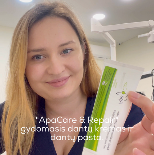 Komplektas "Apacare": emalį stiprinanti dantų pasta (75 ml) ir kramtomoji guma su ksilitoliu ir emalio mineralais (45 vnt.)
