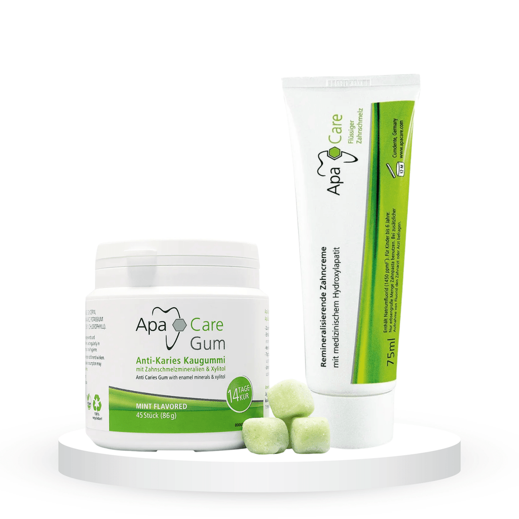 Šį komplektą sudaro "ApaCare Gum" kramtomoji guma su saldikliu ksilitoliu ir emalio mineralais (45 vnt.) ir "Apacare" remineralizuojanti dantų pasta su emalio mineralais (75 ml)