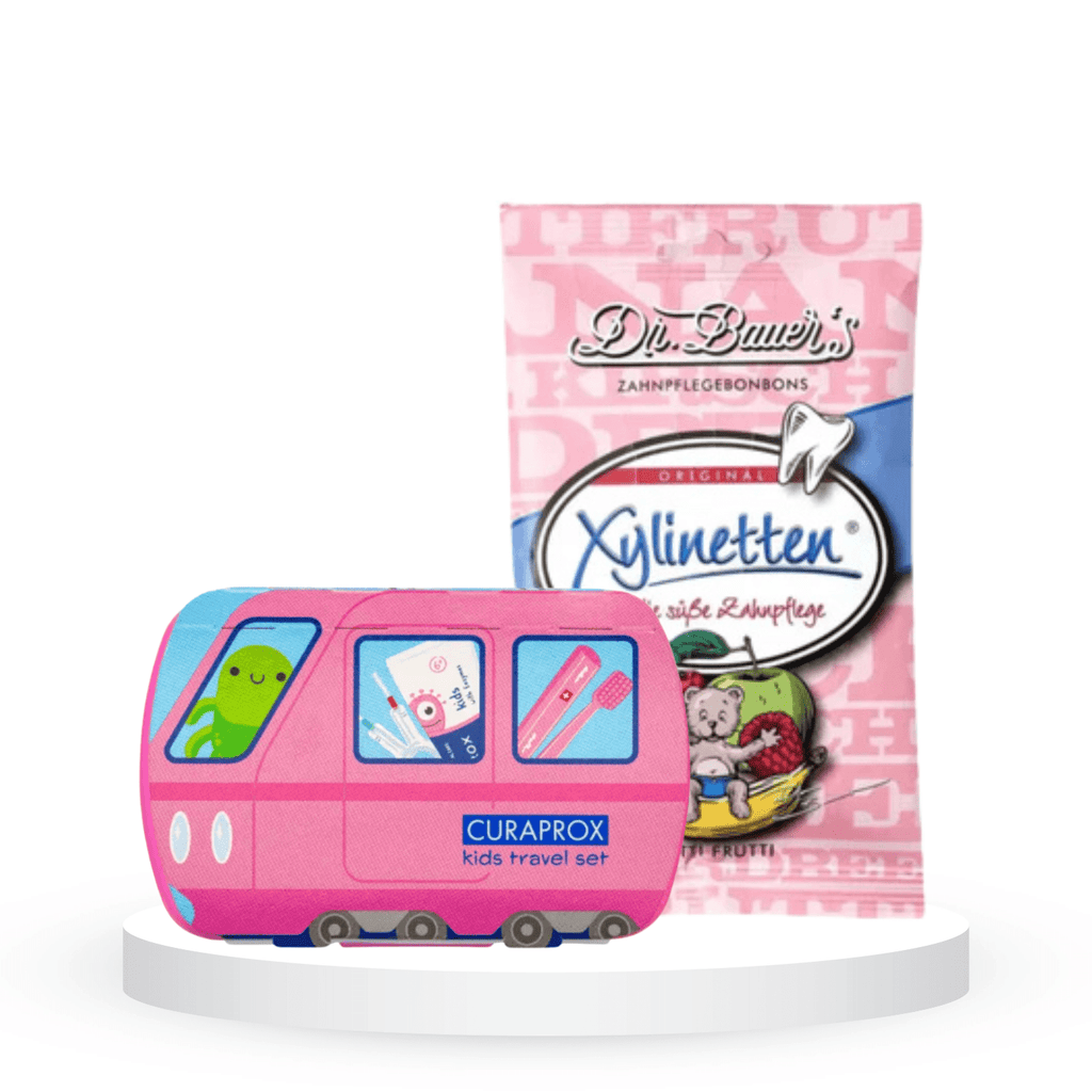 Komplektas vaikams: "Curaprox Kids Travel Set" kelioninis burnos priežiūros rinkinys ir "Dr. Bauer's Xylinetten" pastilės su saldikliu ksilitoliu (30 vnt.)