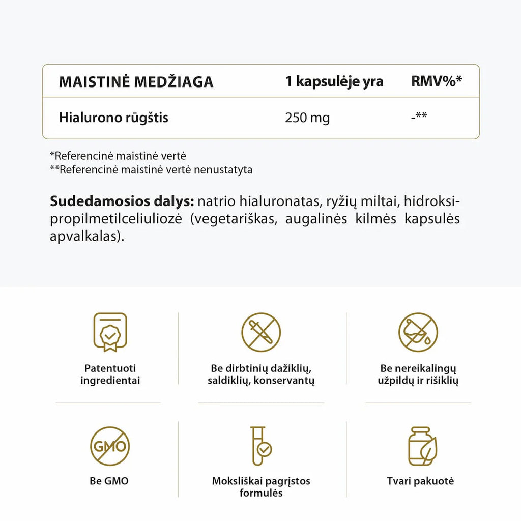 • 250 mg hialurono rūgšties vienoje kapsulėje;