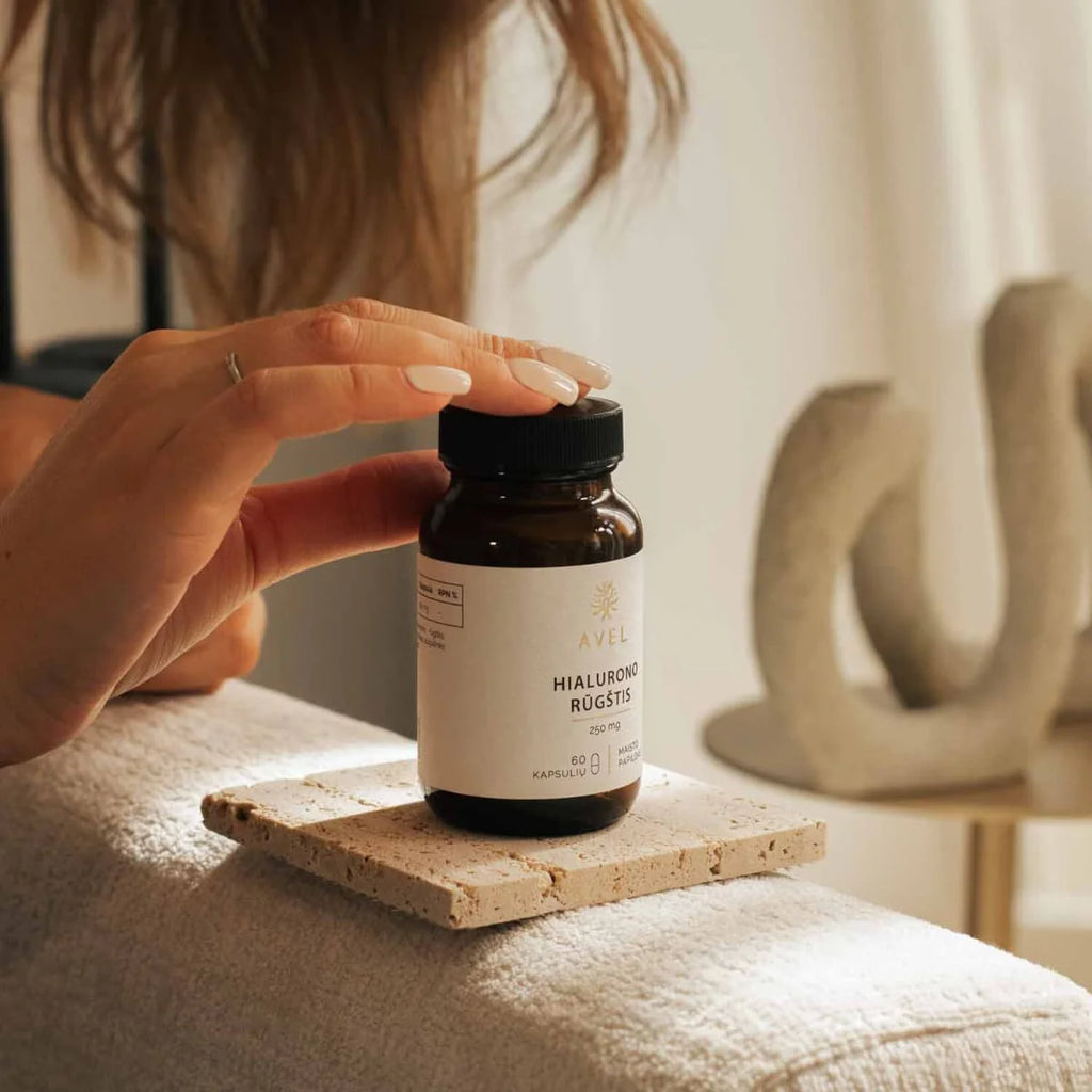 AVEL Hialurono rūgštis – tai maisto papildas, kurio kiekvienoje kapsulėje yra 250 mg hialurono rūgšties. Tai natūrali organizme randama medžiaga, ypač koncentruota jungiamuosiuose audiniuose, kremzlėse, odoje ir akyse. Hialurono rūgštis pasižymi gebėjimu surišti vandenį – tai vienas pagrindinių jos struktūrinių bruožų.